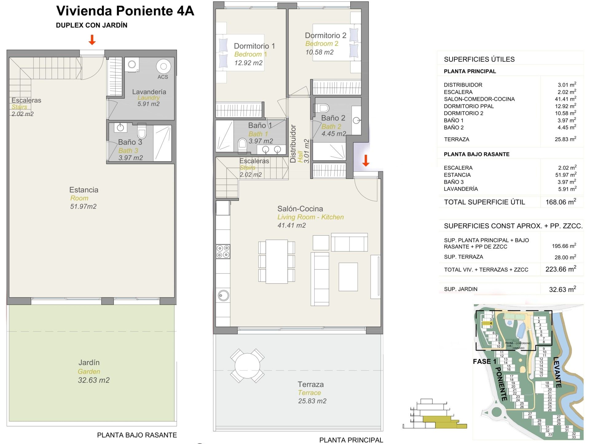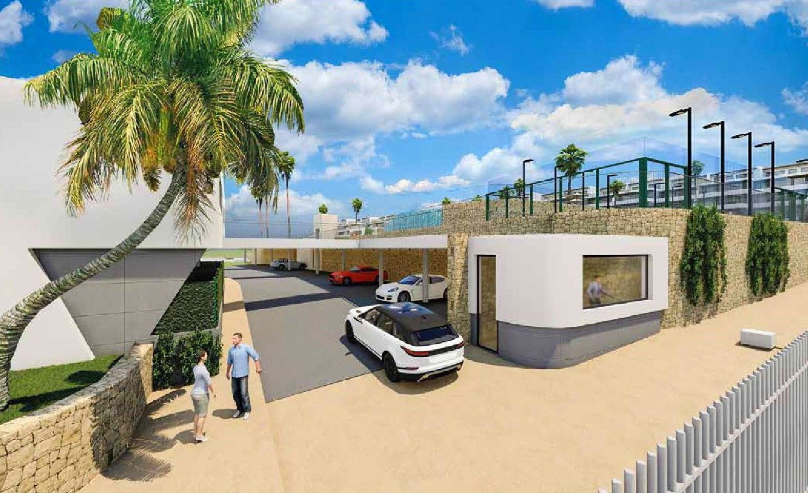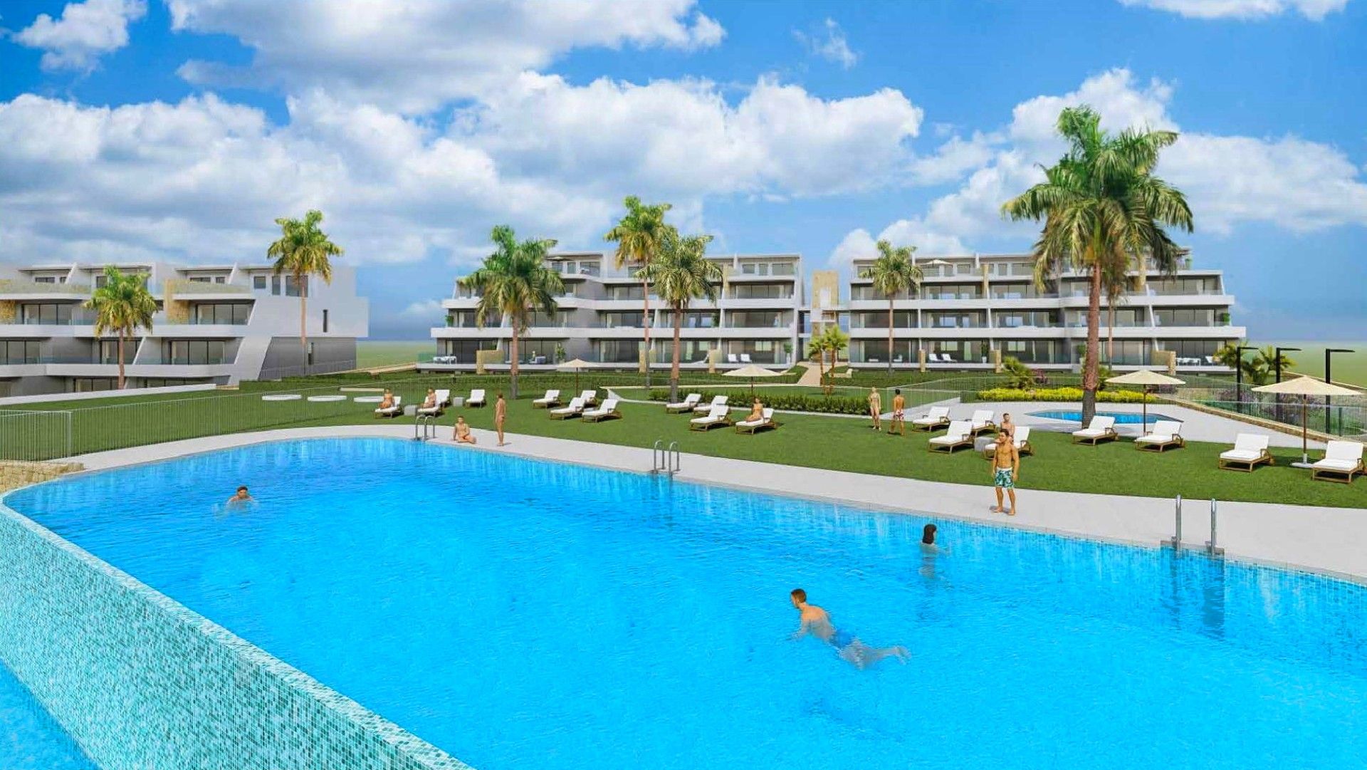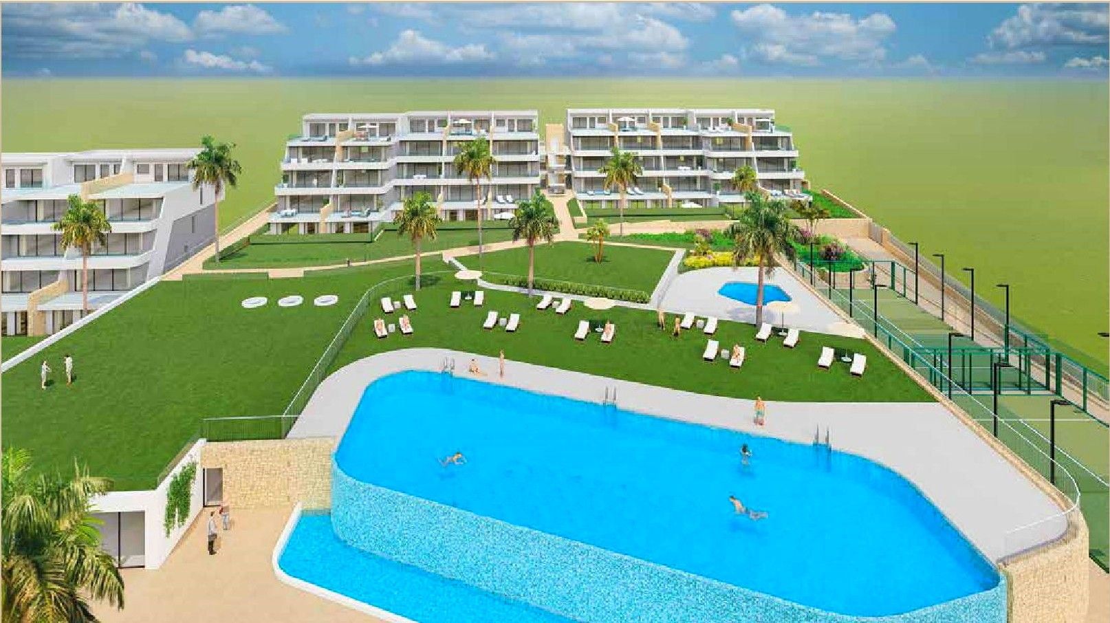 El complejo ofrece una zona ajardinada con una gran piscina exterior desbordante para adultos, piscina infantil, piscina interior climatizada, gimnasio, zona de coworking, un bonito jardín verde con césped y fuentes, zona de relax con tumbonas, una pista de pádel y parking cubierto.