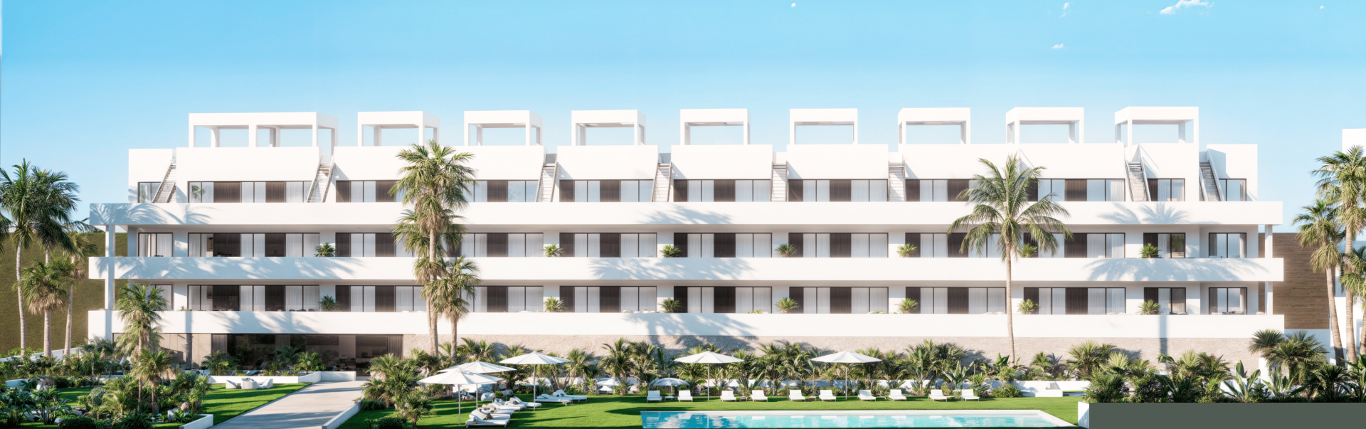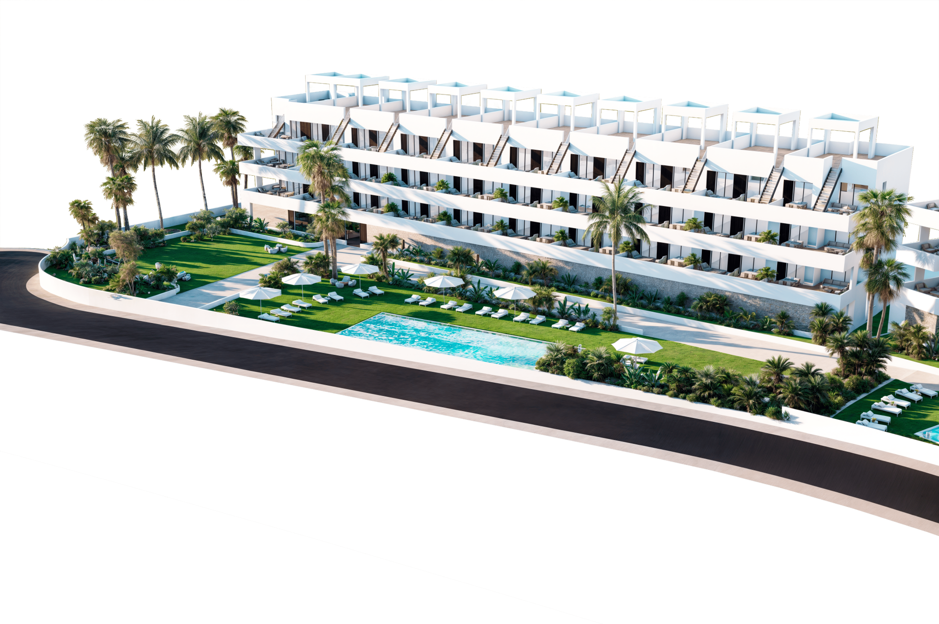 Здесь каждый момент будет наполнен комфортом и гармонией с природой. На обширной территории вы найдете ухоженные сады, где можно проводить время на свежем воздухе, наслаждаясь красотой окружающих ландшафтов. Для любителей активного отдыха предусмотрен общественный корт Paddle-теннис и фитнес-зона. Три прекрасно обустроенных общественных бассейна, уютно укрытых под тенью разнообразной растительности. А для самых маленьких есть специально оборудованная игровая зона, где они могут весело проводить время под наблюдением родителей. В дополнение к этому, вас ждет специально оборудованная уличная площадка для занятий спортом (калистеникой), а также точки зарядки для электромобилей, что делает этот курорт идеальным выбором для экологически сознательных жителей.